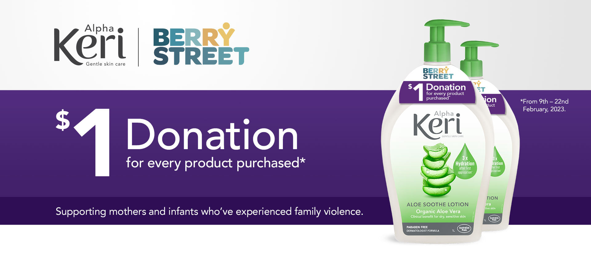 Alpha Keri will be donating $1.00 AUD for every product purchased in Chemist Warehouse and My Chemist stores and online between 9th of February 2023 and 22nd of February 2023 to Berry Street.